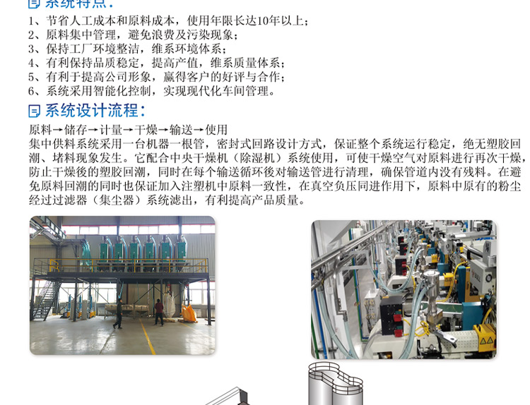 集中供料系统采用一台机一根管,密封式回路设计方式,保证整个系统运行稳定,绝无塑胶回潮、堵料现象发生。它配合中央干燥机(除湿机)系统使用,可使干燥空气对原料进行再次干燥,防止干燥後的塑胶回潮,同时在每个输送循环後对输送管进行清理,确保管道内没有残料。在避免原料回潮的同时也保证加入注塑机中原…